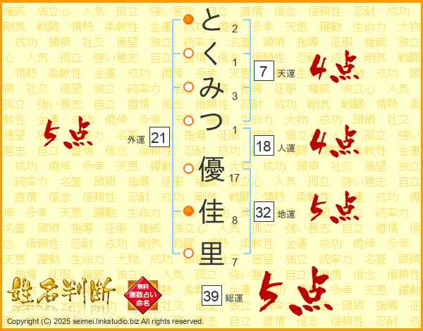 とくみつ優佳里さんの総運は39画の5点!