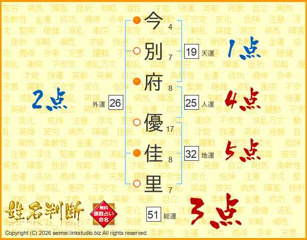 今(4画)別(7画)府(8画) 優(17画)佳(8画)里(7画)
