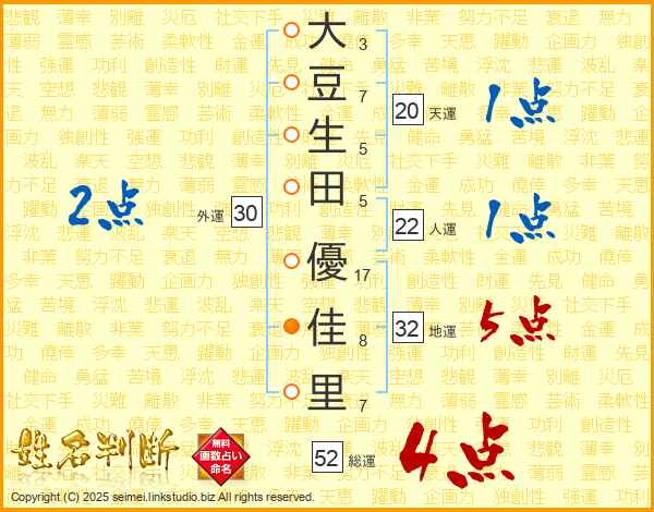 大(3画)豆(7画)生(5画)田(5画) 優(17画)佳(8画)里(7画)