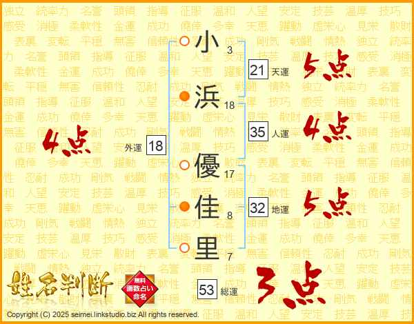 小(3画)浜(18画) 優(17画)佳(8画)里(7画)
