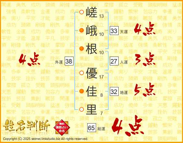 嵯(13画)峨(10画)根(10画) 優(17画)佳(8画)里(7画)