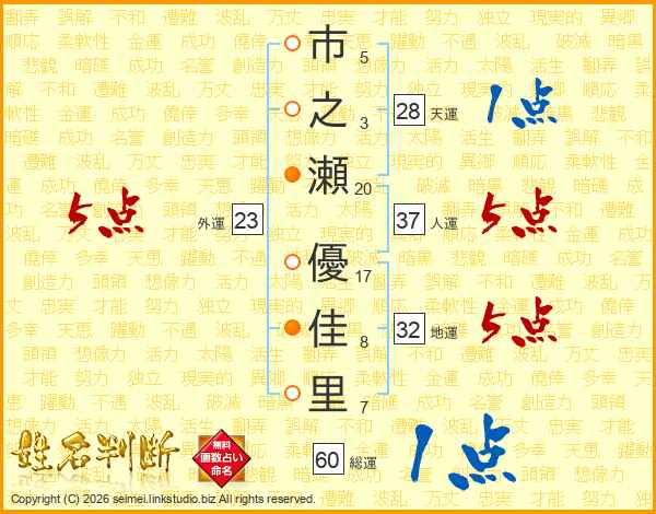 市(5画)之(3画)瀬(20画) 優(17画)佳(8画)里(7画)