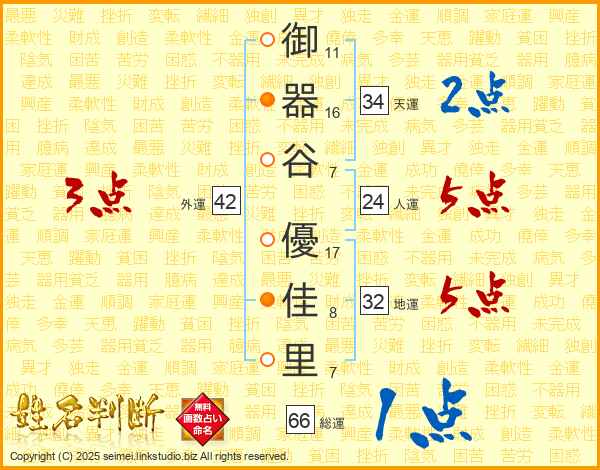 御(11画)器(16画)谷(7画) 優(17画)佳(8画)里(7画)