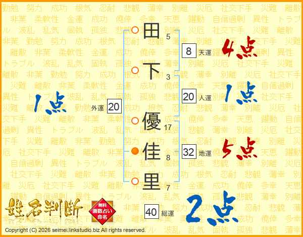 田(5画)下(3画) 優(17画)佳(8画)里(7画)