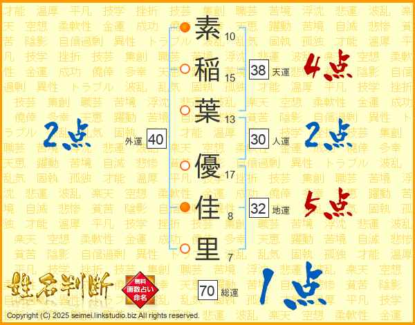 素(10画)稲(15画)葉(13画) 優(17画)佳(8画)里(7画)