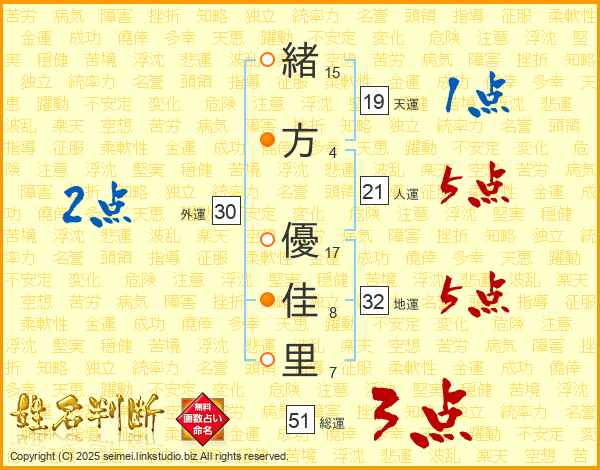緒(15画)方(4画) 優(17画)佳(8画)里(7画)