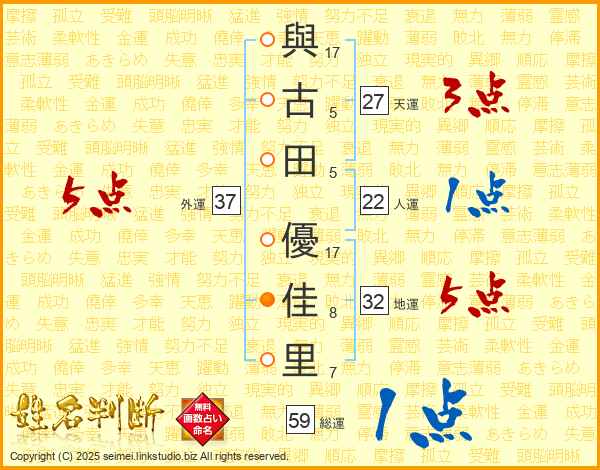 與(17画)古(5画)田(5画) 優(17画)佳(8画)里(7画)