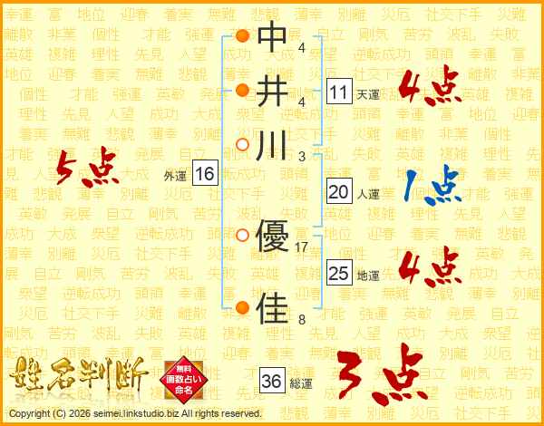 中(4画)井(4画)川(3画) 優(17画)佳(8画)
