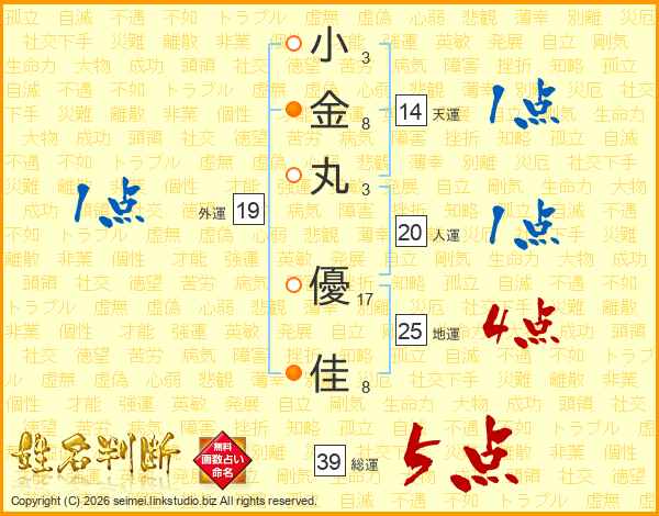 小(3画)金(8画)丸(3画) 優(17画)佳(8画)
