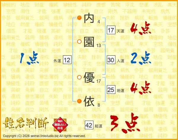 生活面を象徴する運勢です。外部から受ける影響力を表し、結婚運、家庭運や職場、環境への順応性を表します。総運から人運を引いた画数。姓や名が1文字の場合を除く。