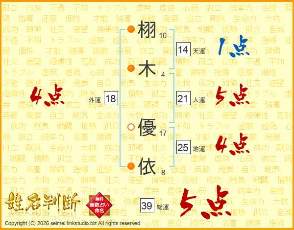 栩(10画)木(4画) 優(17画)依(8画)