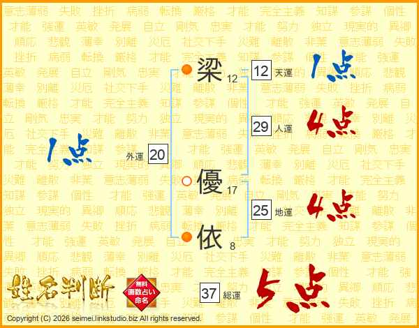生活面を象徴する運勢です。外部から受ける影響力を表し、結婚運、家庭運や職場、環境への順応性を表します。総運から人運を引いた画数。姓や名が1文字の場合を除く。