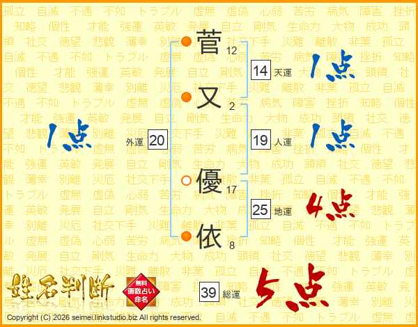 生活面を象徴する運勢です。外部から受ける影響力を表し、結婚運、家庭運や職場、環境への順応性を表します。総運から人運を引いた画数。姓や名が1文字の場合を除く。