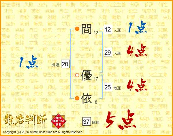 生活面を象徴する運勢です。外部から受ける影響力を表し、結婚運、家庭運や職場、環境への順応性を表します。総運から人運を引いた画数。姓や名が1文字の場合を除く。