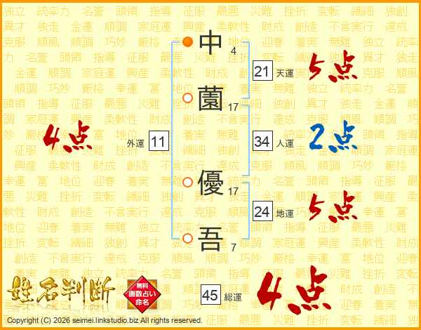 生活面を象徴する運勢です。外部から受ける影響力を表し、結婚運、家庭運や職場、環境への順応性を表します。総運から人運を引いた画数。姓や名が1文字の場合を除く。