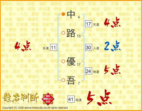 あなたの人生を表す1番重要な運勢です。生涯を通じて影響する総合運となり、主に50歳以降の晩年期に影響を及ぼします。苗字と名前の合計画数。