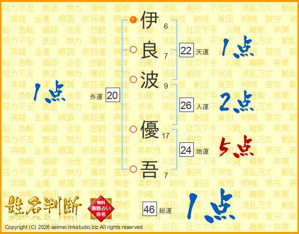 伊(6画)良(7画)波(9画) 優(17画)吾(7画)