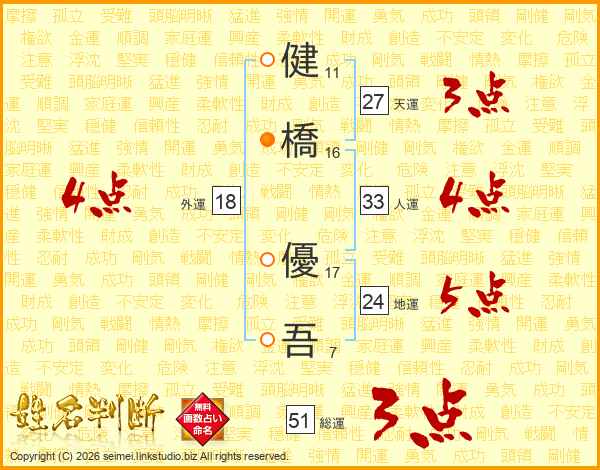 あなたの人生を表す1番重要な運勢です。生涯を通じて影響する総合運となり、主に50歳以降の晩年期に影響を及ぼします。苗字と名前の合計画数。