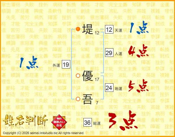 堤(12画) 優(17画)吾(7画)