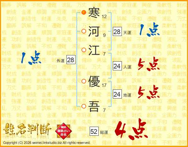 寒河江優吾さんの総運は52画の4点!