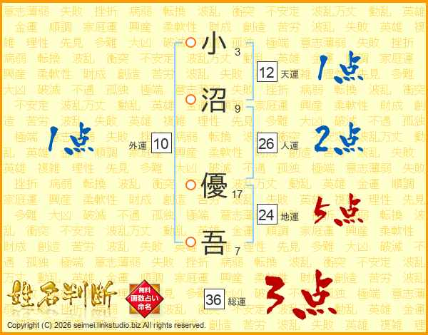 小(3画)沼(9画) 優(17画)吾(7画)
