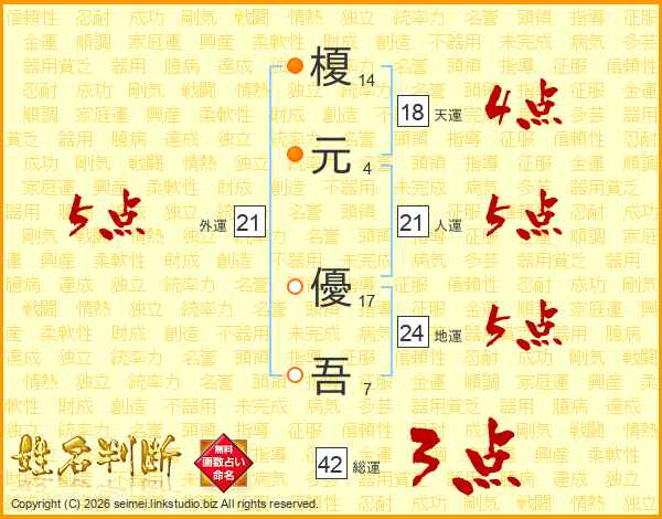 榎(14画)元(4画) 優(17画)吾(7画)