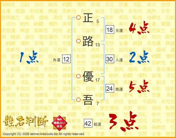 正(5画)路(13画) 優(17画)吾(7画)