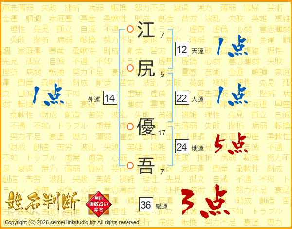 江(7画)尻(5画) 優(17画)吾(7画)