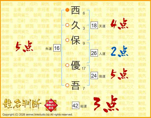 西(6画)久(3画)保(9画) 優(17画)吾(7画)