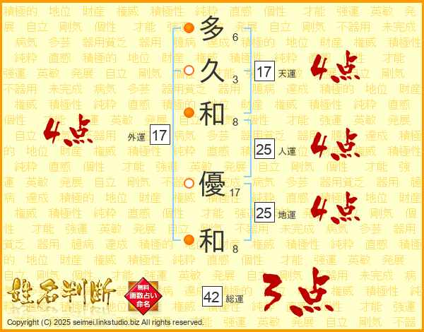 多(6画)久(3画)和(8画) 優(17画)和(8画)