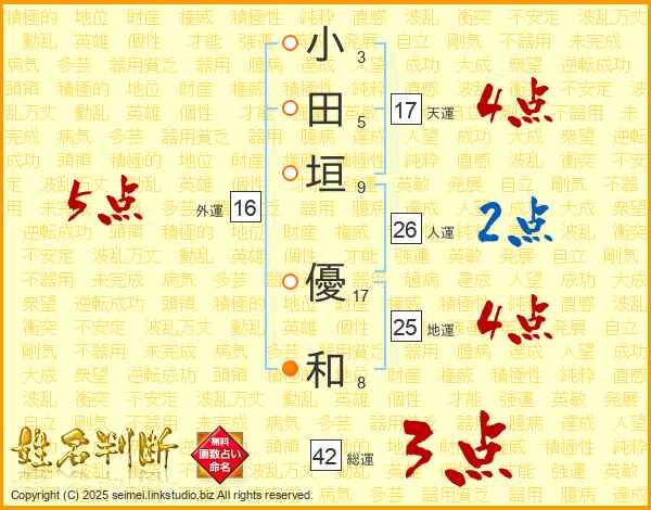 小(3画)田(5画)垣(9画) 優(17画)和(8画)