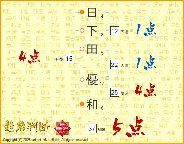 日(4画)下(3画)田(5画) 優(17画)和(8画)