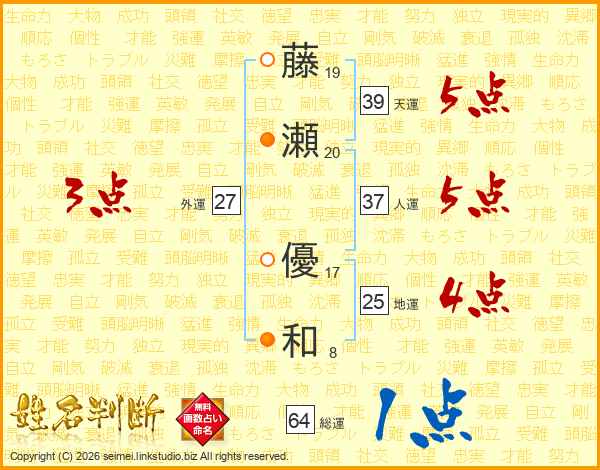 藤(19画)瀬(20画) 優(17画)和(8画)