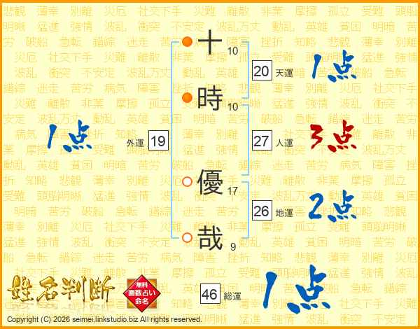 あなたの人生を表す1番重要な運勢です。生涯を通じて影響する総合運となり、主に50歳以降の晩年期に影響を及ぼします。苗字と名前の合計画数。