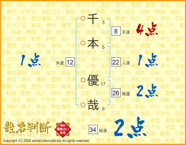 千(3画)本(5画) 優(17画)哉(9画)