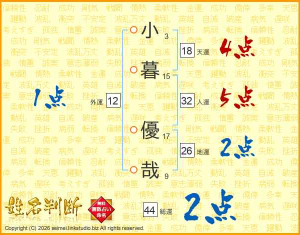 小暮優哉さんの総運は44画の2点!