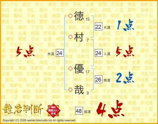 生活面を象徴する運勢です。外部から受ける影響力を表し、結婚運、家庭運や職場、環境への順応性を表します。総運から人運を引いた画数。姓や名が1文字の場合を除く。