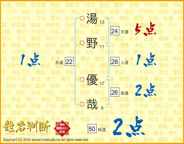 湯野優哉さんの総運は50画の2点!