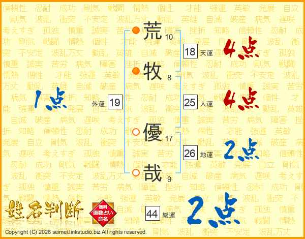 荒(10画)牧(8画) 優(17画)哉(9画)