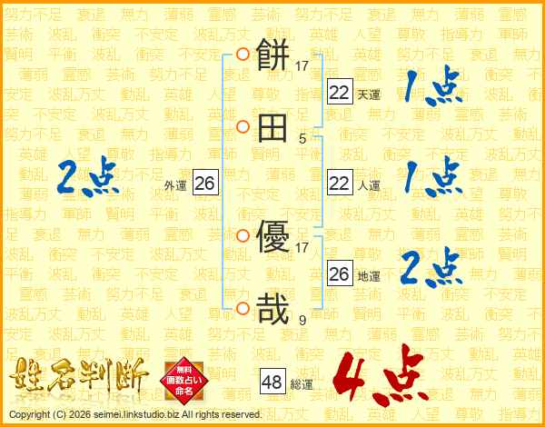 餅(17画)田(5画) 優(17画)哉(9画)