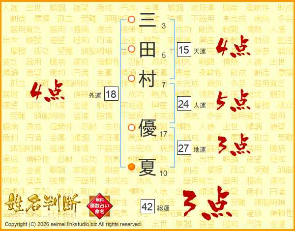 三(3画)田(5画)村(7画) 優(17画)夏(10画)
