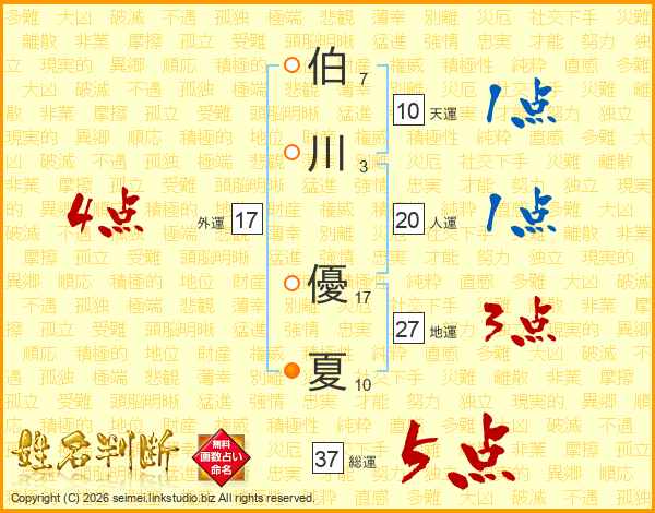 伯(7画)川(3画) 優(17画)夏(10画)