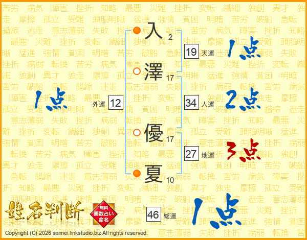 入(2画)澤(17画) 優(17画)夏(10画)