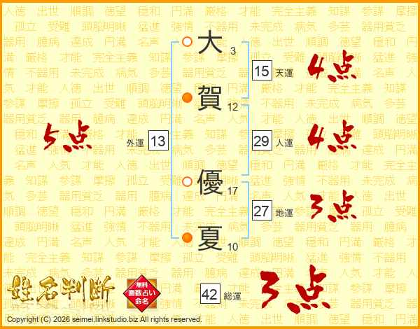 大(3画)賀(12画) 優(17画)夏(10画)