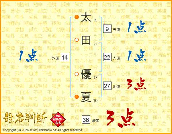 太(4画)田(5画) 優(17画)夏(10画)