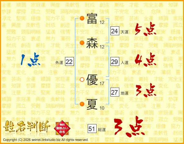 生活面を象徴する運勢です。外部から受ける影響力を表し、結婚運、家庭運や職場、環境への順応性を表します。総運から人運を引いた画数。姓や名が1文字の場合を除く。