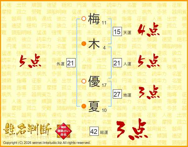 梅(11画)木(4画) 優(17画)夏(10画)