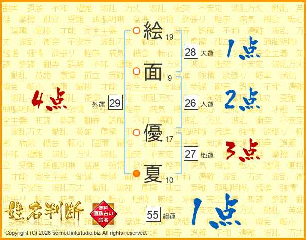 絵(19画)面(9画) 優(17画)夏(10画)