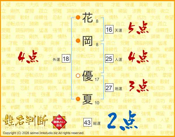 あなたの人生を表す1番重要な運勢です。生涯を通じて影響する総合運となり、主に50歳以降の晩年期に影響を及ぼします。苗字と名前の合計画数。
