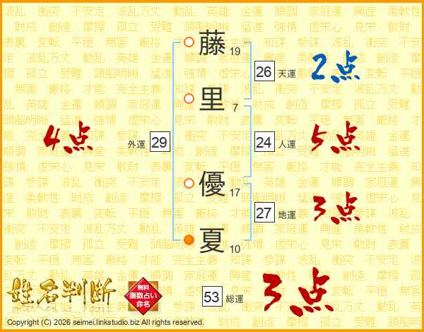 藤(19画)里(7画) 優(17画)夏(10画)